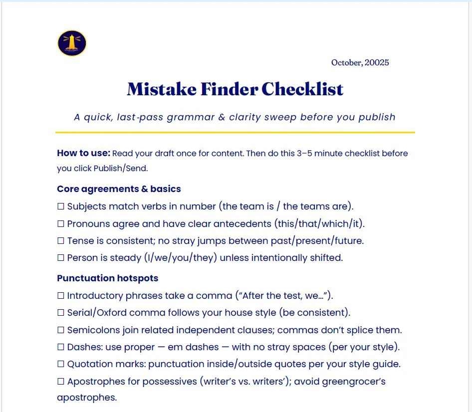 This one-page checklist gives you a clean, final sweep before you hit Publish. It covers the silent mistakes spellcheckers miss, like wrong-but-real words, punctuation shifts, and formatting quirks. Keep it by your side for every draft, proposal, or paper that needs to land clean and clear.