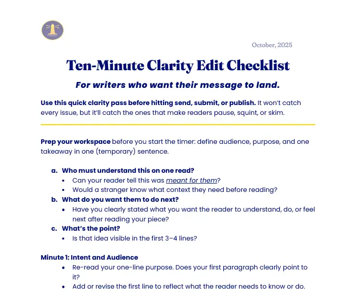 Sharpen your writing in 10 minutes. This checklist helps you clarify purpose, tighten structure, and reduce reader confusion. Ideal for blog posts, op-eds, website copy, or anything public-facing. Quick pass, real impact, and no red pen required.