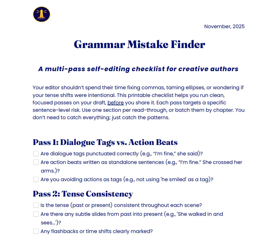 Spot sneaky grammar mistakes before your editor does. This calm, multi-pass checklist helps you fix dialogue tags, tense drift, POV slips, and overused punctuation without stripping your voice. Ideal for fiction drafts, beta reader prep, or polishing chapters before submission.