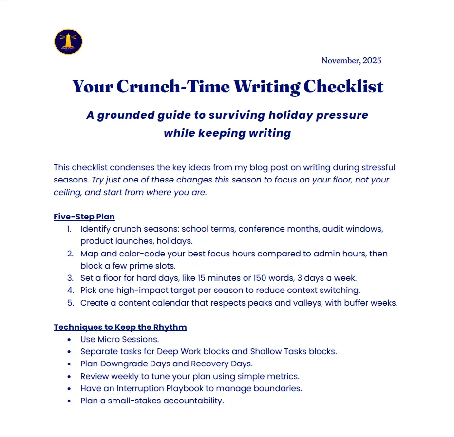 This brief checklist summarizes the blog on Writing in Crunch Time like holiday seasons. Use it to calm your writing stress as the holidays ramp up, and improve your productivity!