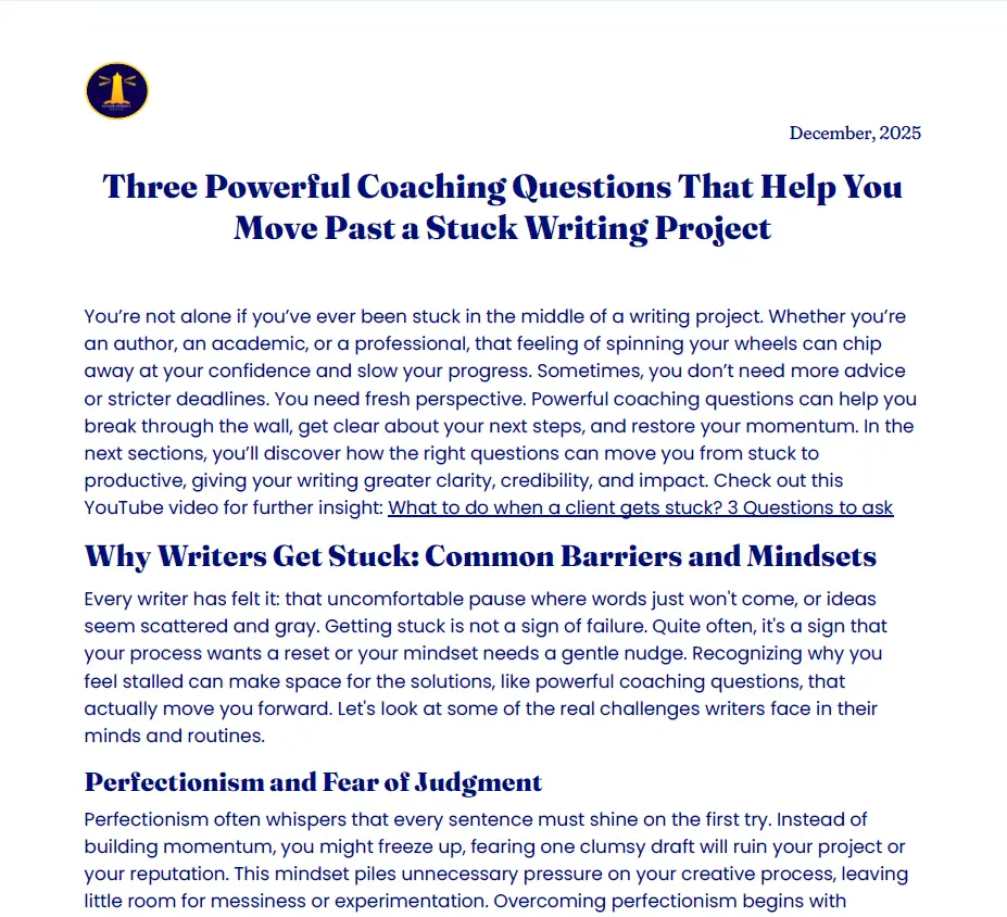 This substantive deep dive is a fast read. It presents three coaching questions that can help you restart a writing project when you’re feeling stuck, especially if the barrier is internal, not technical. Each page holds one small shift.
