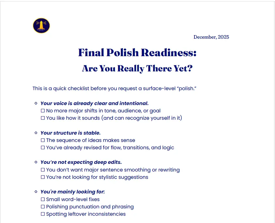 This one-page checklist outlines the standard silent edits I might make during every project, mechanical fixes like typos, punctuation, and formatting adjustments that support consistency and clarity without changing your voice.