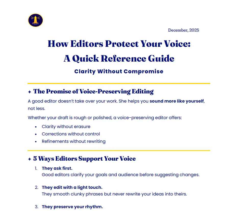 This one-page PDF captures the 5 ways editors support your voice and the 4 signs of your voice being overwritten. Download while you’re here and save it as a reference.