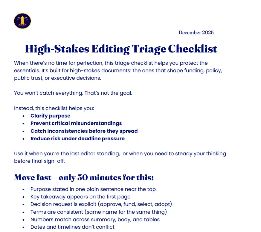 When the deadline is brutal and the stakes are high, this 30-minute checklist helps you protect meaning, consistency, and credibility. It’s designed for decision-critical documents like executive memos, grant proposals, and public statements. Use it to focus your edits when there’s no time for perfection.