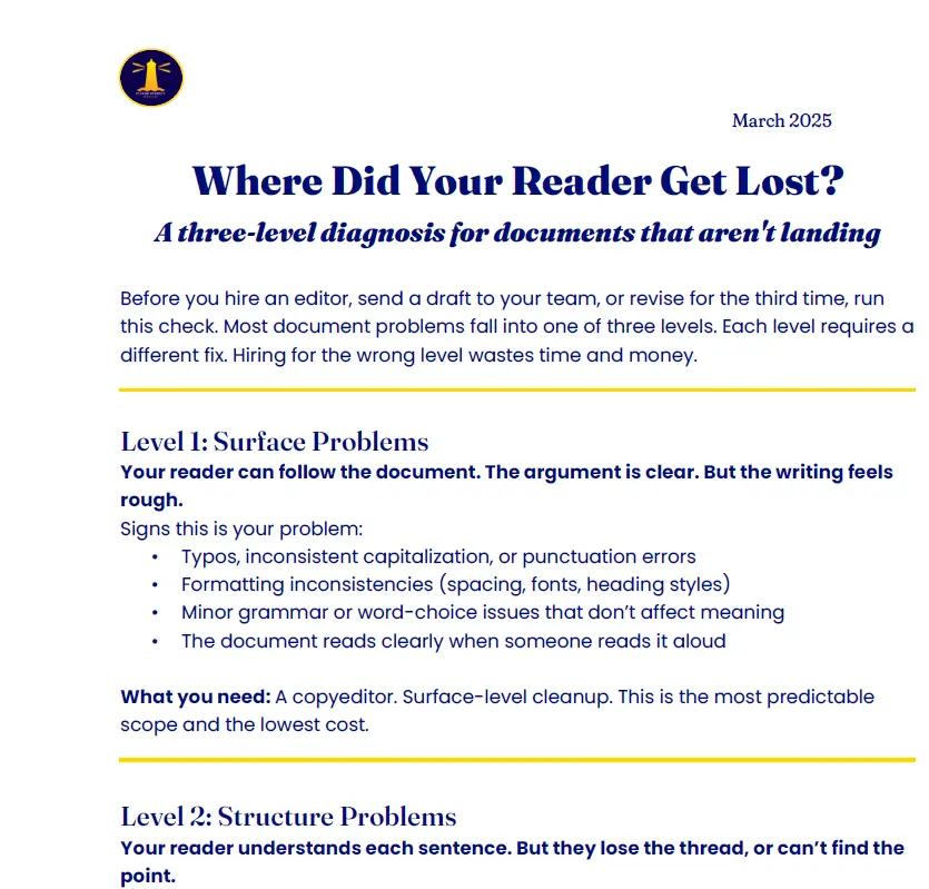 This one-page guide helps you spot common clarity traps, evaluate your tone and trust signals, and tighten the structure of your business documents.