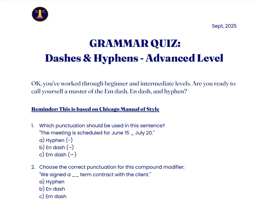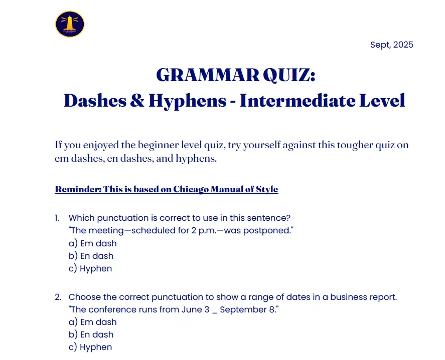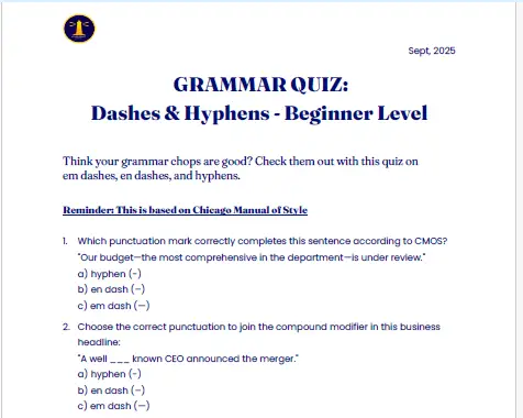 Think you know your hyphens from your em dashes? Take a minute and test your grammar instincts with the Beginner Dash Quiz.