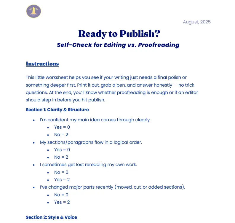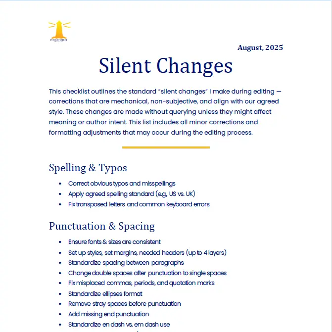 Not every correction needs a comment or your time to approve. This one-page checklist outlines the standard silent edits I might make during every project, mechanical fixes like typos, punctuation, and formatting adjustments that support consistency and clarity without changing your voice.