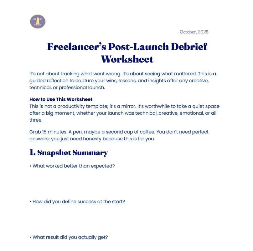 This worksheet is an all-purpose debrief for freelancer efforts, focusing on how the project worked out.